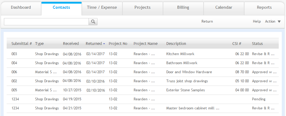This screen displays all submittals associated with a project. It can be accessed by selecting List from the Action drop-down on the Submittals panel of the Projects > Logs screen.