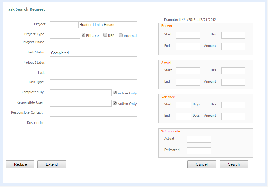 Every module in ArchiOffice Online has a search function that you can use to locate records matching specific search criteria. With the Task Search Request screen you can perform a search for task using any combination of criteria.
